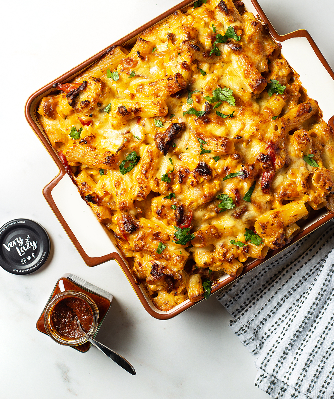 Time to load in the good stuff! Add your Very Lazy Cajun Paste, followed by your cheese (keep aside 75g of Cheddar to top), seasoning and heat gently until melted, oozy and combined. Add a little more milk to loosen if needed.