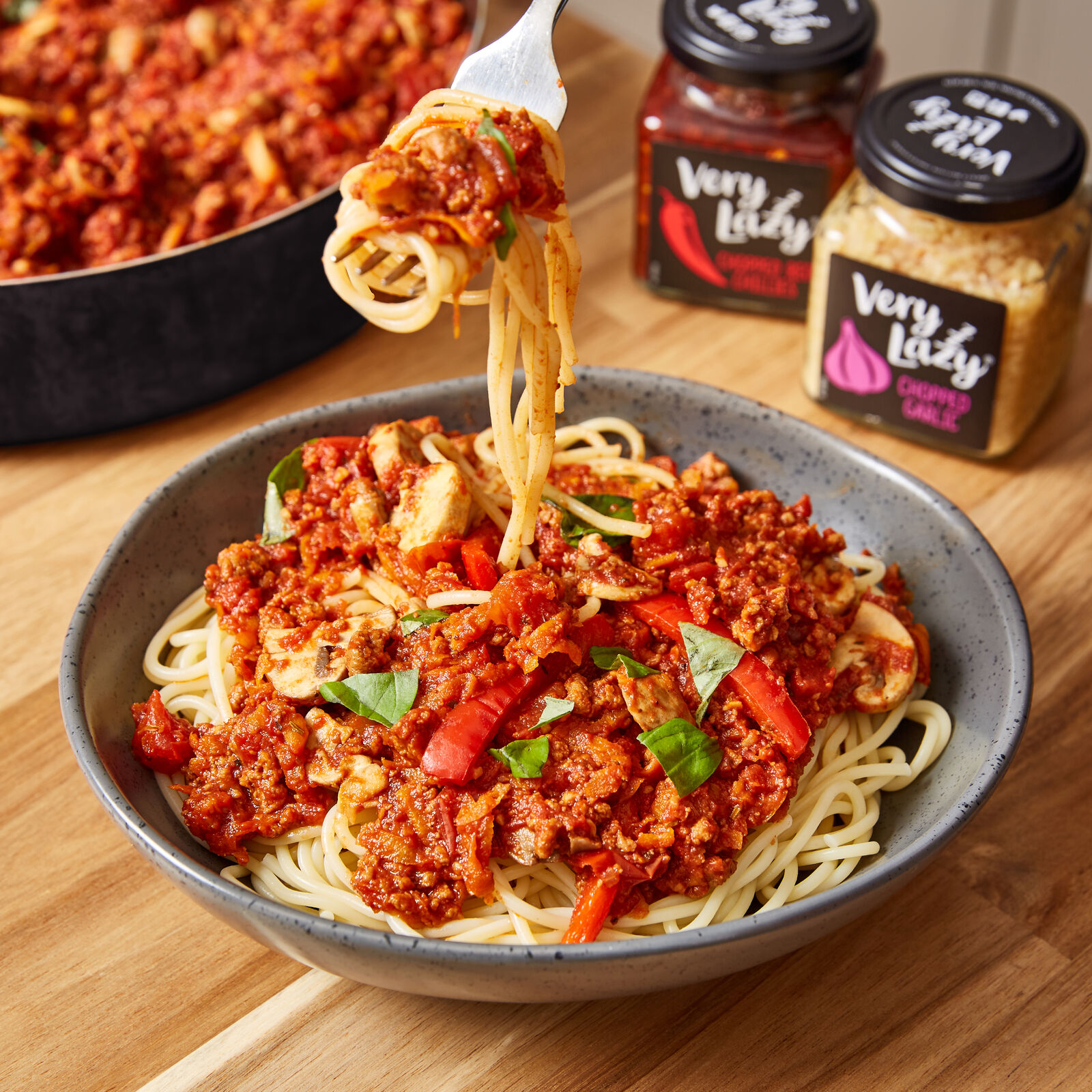 Heat oil in a large pan, add the Very Lazy Chopped Garlic, red pepper and mushrooms, season with salt and pepper, cook on a mid-high heat until mushrooms are soft and peppers are slightly browned.